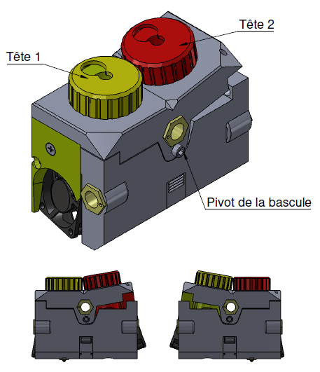 Les 2 deux têtes sont montées sur un support oscillant qui permet de remonter la tête qui n’est pas active.